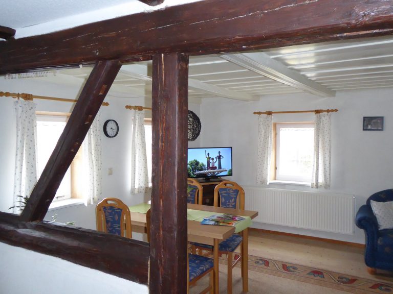 Die gemütliche und ruhige 2 Zimmer Wohnung mit 45 m² befindet sich im 1. Stock. Sie verfügt über ein großes Schlafzimmer mit Doppelbett und großem Einbauschrank. Hier ist noch Platz für ein Kinderbett oder eine zusätzliche Aufbettung. Das Bad hat eine Dusche, 1 Waschbecken und WC mit Fensterblick auf den Garten. Im Wohn- und Essbereich können Sie gemütliche Stunden verbringen, spielen, lesen oder fernsehen. Die Küche ist durch ein offenes Fachwerk von dem Essbereich abgetrennt. Hier finden Sie alles um zu Kochen oder das gemeinsame Frühstück vorzubereiten. Ein großzügiger Flur bietet genügend Möglichkeiten, um Jacken, Schuhe oder Koffer abzustellen.